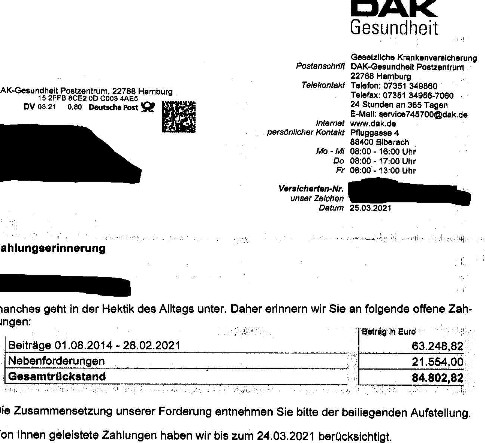 Beitragsforderung der DAK in Höhe von über 85.000 € ohne jegliche rechtliche Grundlage(Stand März 2021)Es werden seit über 6 Jahren monatliche Beiträge erhoben, obwohl zu keiner Zeit eine Mitgliedschaft zur dieser Krankenkasse zustande kam. Es bestand zwar die Absicht, einen Kassenwechsel zur DAK durchzuführen, der jedoch auf ganzer Linie gescheitert ist.