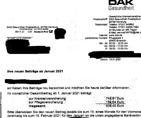 So wurde über den langen Zeitbereich an verschiedenen Stellen der DAK opponiert, jedoch ohne eine Reaktion zu erhalten. Es scheint fast so, als wenn man glauben würde, dass sich eine Lösung für die DAK entwickeln könnte, wenn weiterhin ein beharrliches Schweigen und weitere absurde Forderungen erhoben werden. So wird, wie das oben gezeigte Schreiben vom 13.01.2021 belegt, mittlerweile ein monatlicher Beitragssatz von über 900 € erhoben und dies ohne jegliche Rechtsgrundlage.