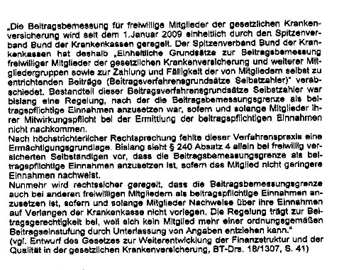 Bei den hauptberuflich gewerbetreibende freiwillig versicherten Mitglieder gab hierzu überhaupt keine Regelung. Wenn ein solches Mitglied keine Angaben macht, kann davon ausgegangen werden, dass sein Einkommen über der Beitragsbemessungsgrenze liegt. Wenn jedoch ein über Jahre arbeitsloses freiwillig versichertes Mitglied keine Angaben über seine finanzielle Situation machen würde, kann man eher davon ausgehen, dass er vielleicht psychische Probleme oder anderweitigen Ärger hat, als das seine gängige finanzielle Situation von beispielsweise 700 € im Monat auf ca. 4700 € (Beitragsbemessungsgrenze Stand 2020) ansteigen würde.